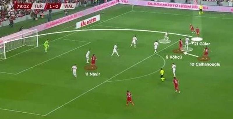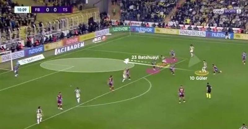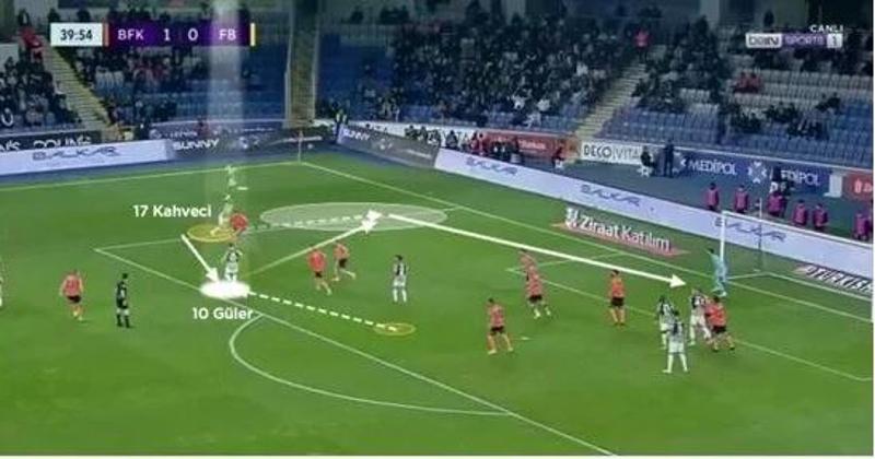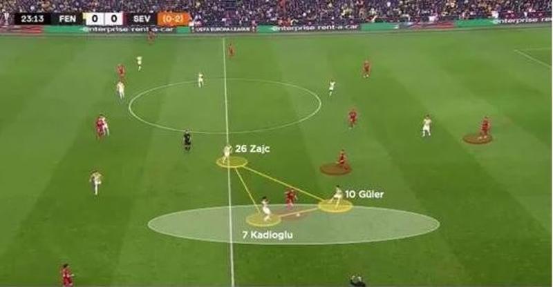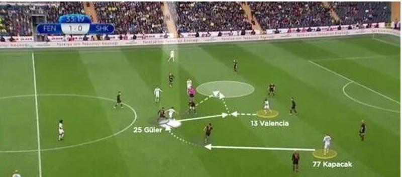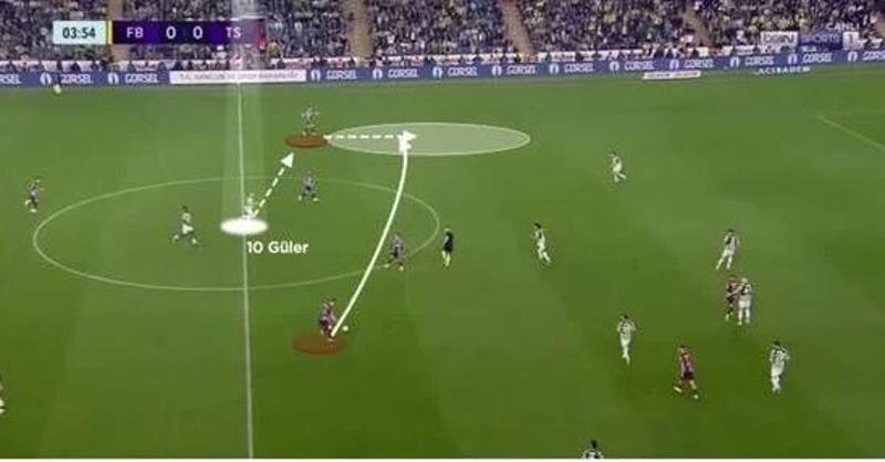 Arda Güler buradan hücumdaki takım arkadaşlarıyla birleşebileceğini gösterdi. Fenerbahçe'de forvet arkasındaki üçlü hücum hattında çoğunlukla onun iki yanında oynayan Batshuayi ve İrfan Can Kahveci (altta) bundan en çok yararlanan isimler oldu. Onların önünde Valencia ya da Joao Pedro, ikili mücadeleleri mümkün kılmak için destek koşuları yaptı ya da sonraki ortalara veya kesiklere saldırmaya çalıştı.