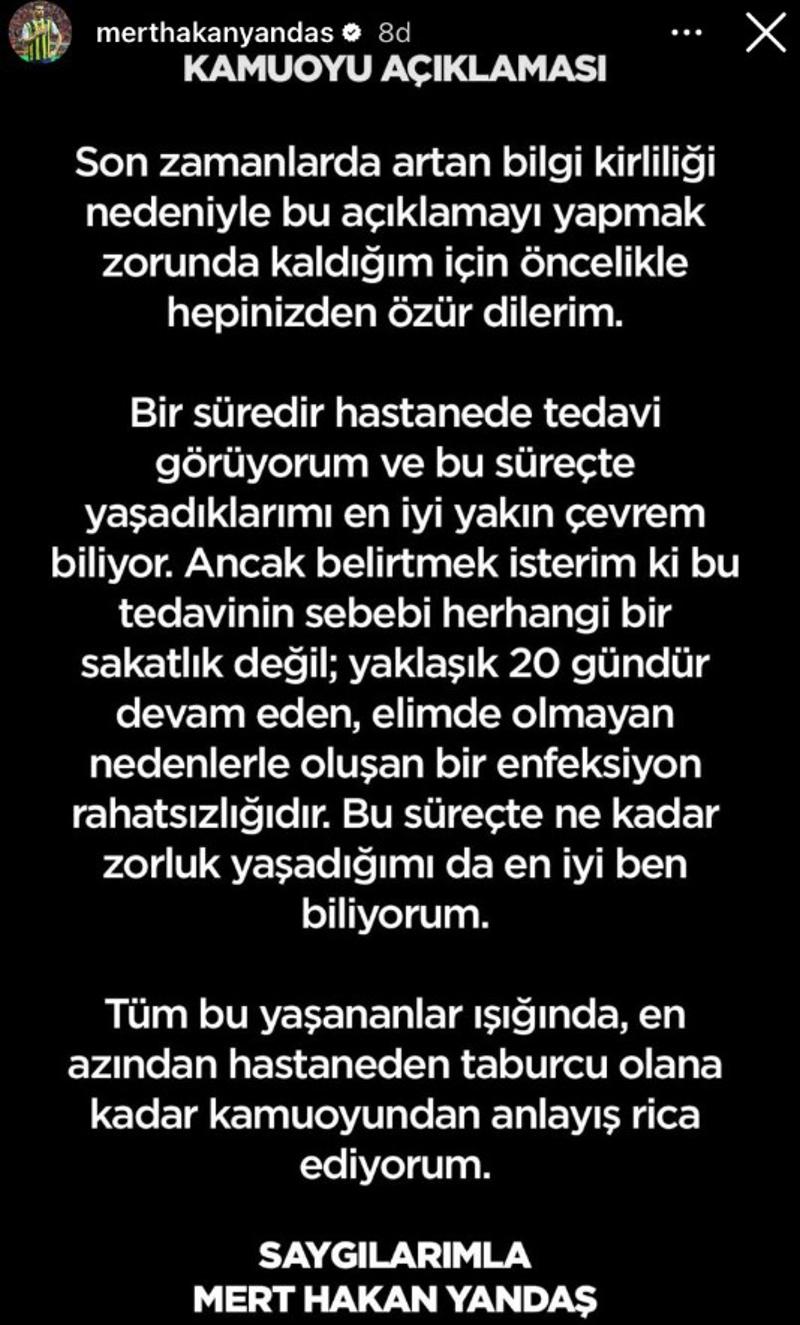 Enfeksiyon yüzünden hastanede tedavi gören ve sezonu kapattığı iddia edilen Fenerbahçe futbolcusu Mert Hakan Yandaş, sosyal medya hesabından açıklama yayınladı.