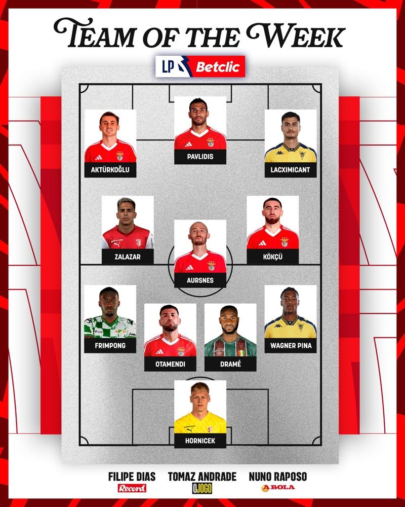 Hornicek (Braga), Wagner Pina (Estoril Praia), Drame (CF Estrela Amadora), Otamendi (Benfica), Frimpong (Moreirense), Orkun Kökçü (Benfica), Aursnes (Benfica), Zalazar (Braga), Lacximicant (Estoril Praia), Kerem Aktürkoğlu (Benfica), Pavlidis (Benfica).