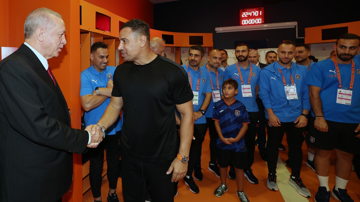 Erdoğan, soyunma odasında kendisini alkışlarla karşılayan RAMS Başakşehir Kulübü futbolcularını ve teknik ekibini tebrik etti.