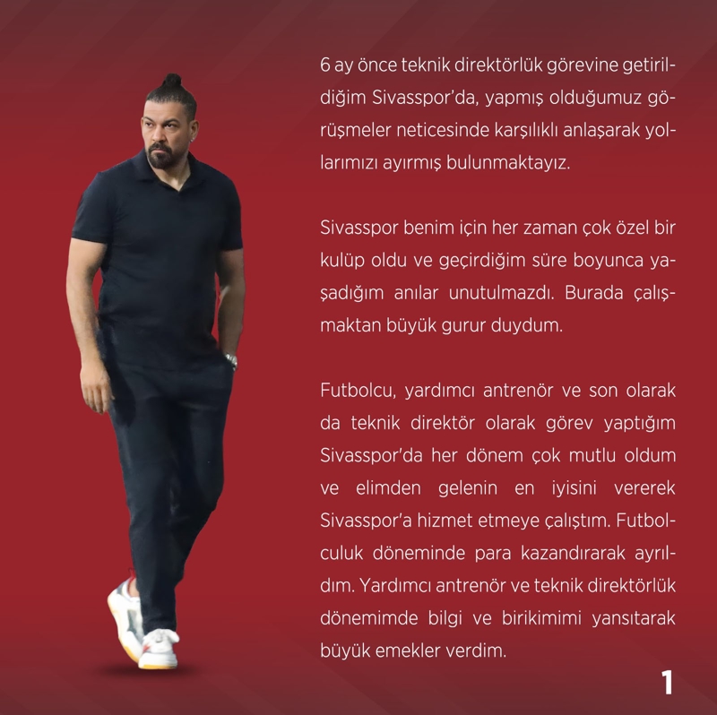 "6 ay önce teknik direktörlük görevine getirildiğim Sivasspor'da, yapmış olduğumuz görüşmeler neticesinde karşılıklı anlaşarak yollarımızı ayırmış bulunmaktayız. Sivasspor benim için her zaman çok özel bir kulüp oldu ve geçirdiğim süre boyunca yaşadığım anılar unutulmazdı. Burada çalışmaktan büyük gurur duydum. Futbolcu, yardımcı antrenör ve son olarak da teknik direktör olarak görev yaptığım Sivasspor'da her dönem çok mutlu oldum ve elimden gelenin en iyisini vererek Sivasspor'a hizmet etmeye çalıştım. Futbolculuk döneminde para kazandırarak ayrıldım. Yardımcı antrenör ve teknik direktörlük dönemimde bilgi ve birikimimi yansıtarak büyük emekler verdim. Gelinen süreçte yolların ayrılması her iki taraf için de daha uygun olacağı düşüncesiyle bugün itibari ile çok sevdiğim görevimi bırakmış bulunmaktayım. Yönetim kuruluna, oyuncu arkadaşlarıma, teknik ekibime ve kulüp çalışanlarına birlikte çalıştığımız süre boyunca gösterdikleri özveri, gayret ve uyum için teşekkür ediyorum. Ligde geride kalan maçlarda Sivasspor'a yürekten başarılar diliyorum."