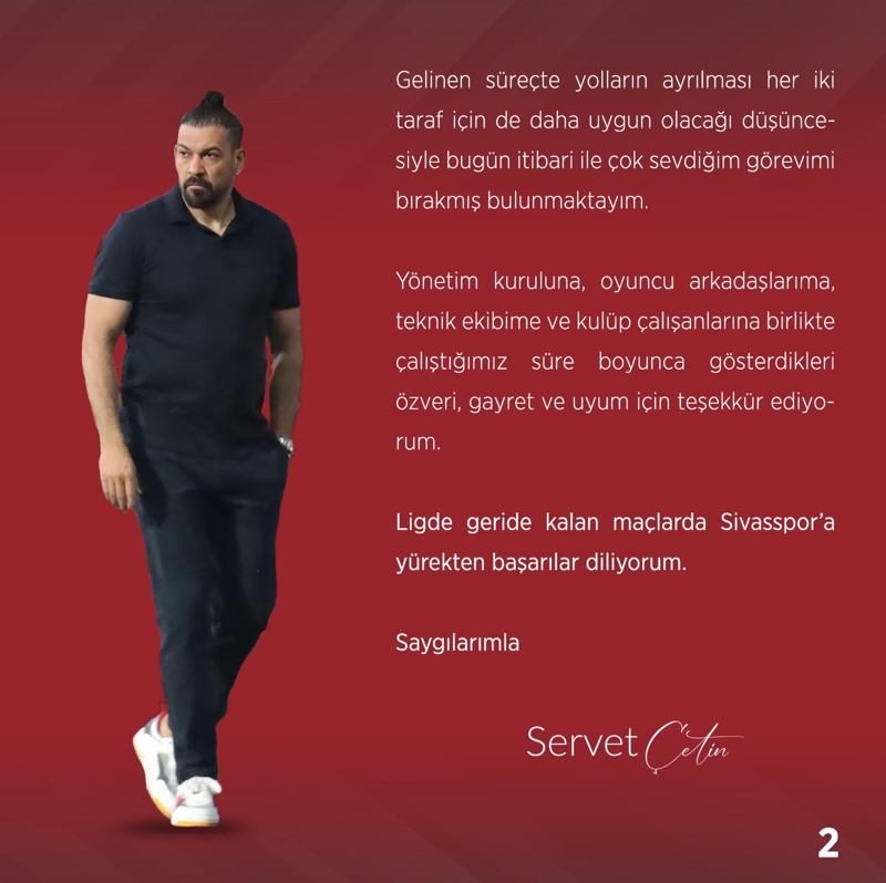 Sivasspor teknik direktörü Servet Çetin sosyal medya hesabından yaptığı açıklamayla takımdan ayrıldığını açıkladı.