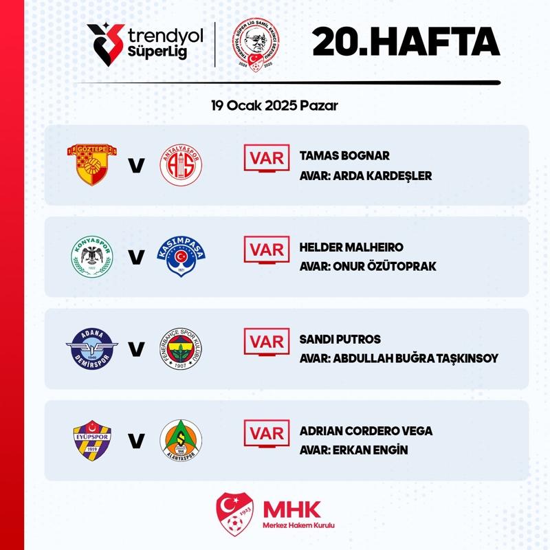 Öte yandan Süper Lig'de bugün oynanacak Göztepe - Antalyaspor maçının VAR'ı Macar hakem Tamas Bugnar, Konyaspor - Kasımpaşa karşılaşmasının VAR'ı Portekizli Helder Malheiro ve Eyüpspor - Alanyaspor mücadelesinin VAR'ı ise İspanyol Adrian Cordero Vega oldu.