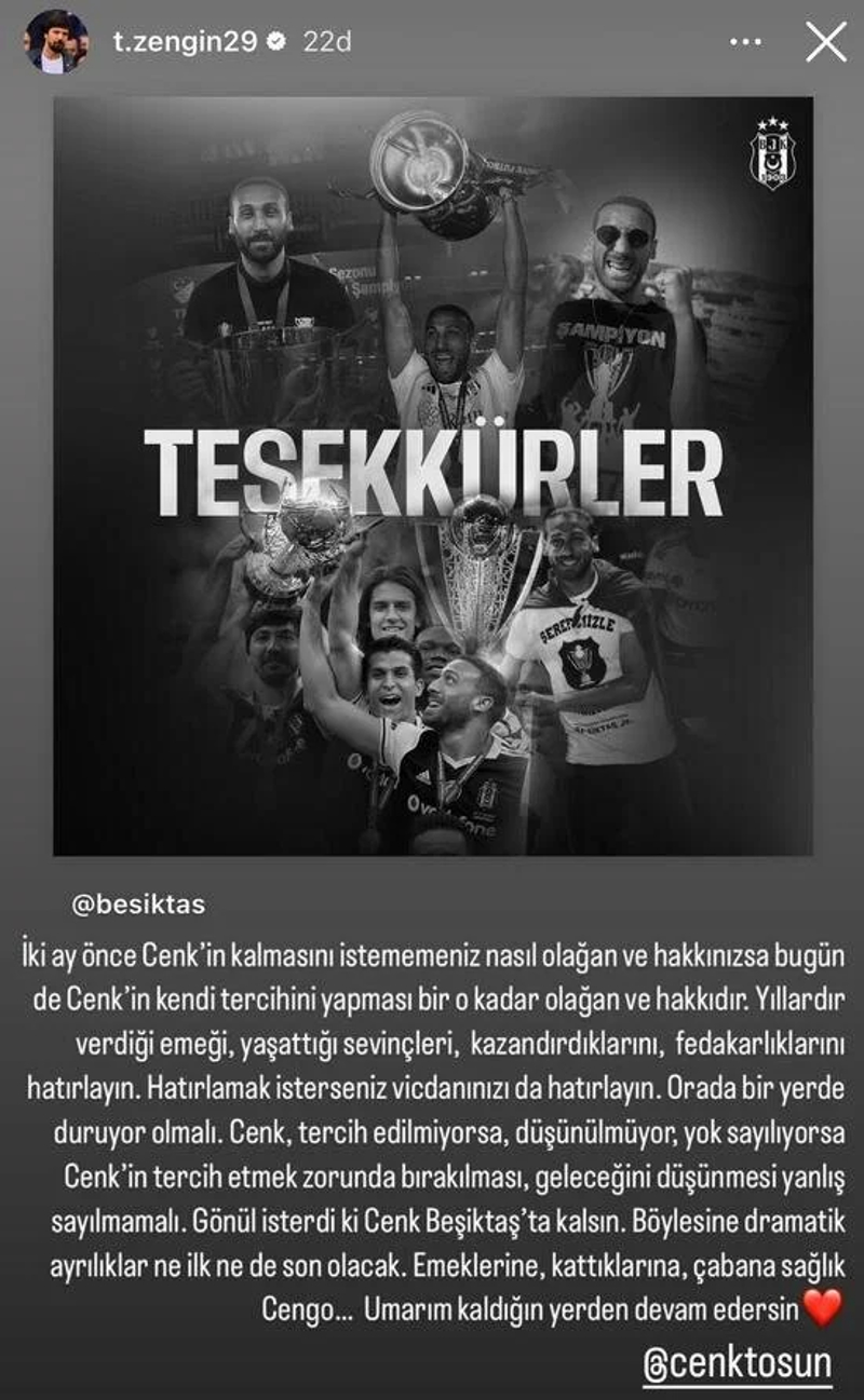 Siyah-beyazlı takımın eski kalecisi paylaşımında "İki ay önce Cenk'in kalmasını istememeniz nasıl olağan ve hakkınızsa bugün de Cenk'in kendi tercihini yapması bir o kadar olağan ve hakkıdır. Yıllardır verdiği emeği, yaşattığı sevinçleri, kazandırdıklarını, fedakarlıklarını hatırlayın. Hatırlamak isterseniz vicdanınızı da hatırlayın. Orada bir yerde duruyor olmalı. Cenk, tercih edilmiyorsa, düşünülmüyor, yok sayılıyorsa Cenk'in tercih etmek zorunda bırakılması, geleceğini düşünmesi yanlış sayılmamalı. Gönül isterdi ki Cenk Beşiktaş'ta kalsın. Böylesine dramatik ayrılıklar ne ilk ne de son olacak. Emeklerine, kattıklarına, çabana sağlık Cengo... Umarım kaldığın yerden devam edersin" ifadelerini kullandı.