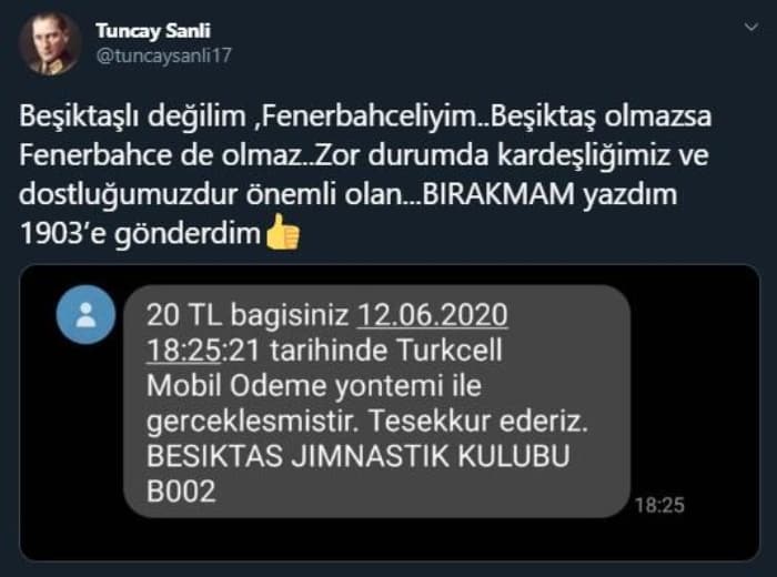 Şanlı, Twitter hesabından yaptığı paylaşımda, "Beşiktaşlı değilim, Fenerbahçeli'yim... Beşiktaş olmazsa Fenerbahçe de olmaz... Zor durumda kardeşliğimiz ve dostluğumuzdur önemli olan... BIRAKMAM yazdım 1903'e gönderdim" ifadelerini kullandı.