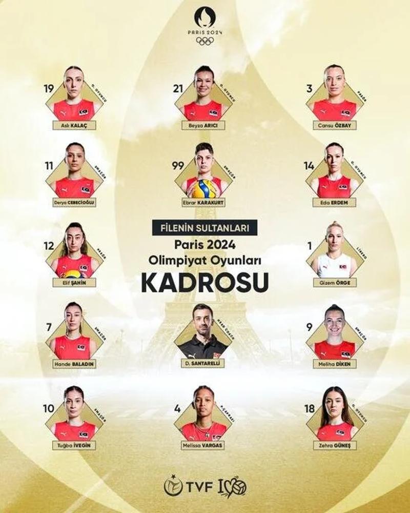 Fransa'nın başkenti Paris'in ev sahipliğinde gerçekleştirilecek olan Paris 2024 Olimpiyat Oyunları'nda Türkiye'yi temsil edecek A Milli Kadın Voleybol Takımı'nın 12+1 kişilik kadrosu açıklandı.