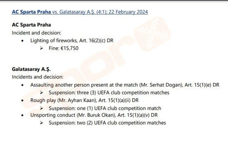 UEFA Disiplin Komitesi, UEFA Avrupa Ligi Son 16 Play-off Turu rövanşında 22 Şubat'ta Prag'da oynanan Sparta Prag - Galatasaray karşılaşmasında yaşanan olaylarla ilgili cezalarını resmi internet sitesinden duyurdu.
