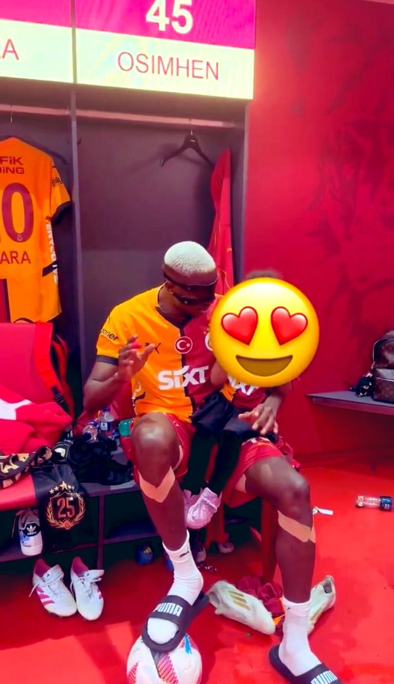 Osimhen, şampiyonluk kutlamaları sonrası 5 yıldızlı Galatasaray formasıyla soyunma odasında kızıyla üçlü çektirdiği anı takipçileriyle paylaştı.
