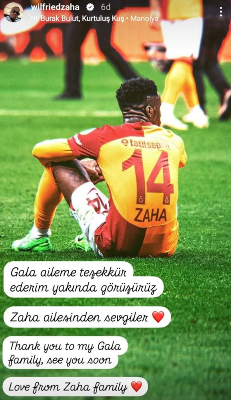 Zaha, Lyon ile anlaşma imzalamasının ardından yaptığı paylaşımla sarı-kırmızılı taraftarlara veda etti. Zaha, Galatasaray formalı paylaşımında, "Gala aileme teşekkür ederim yakında görüşürüz. Zaha ailesinden sevgiler." ifadelerine yer verdi.