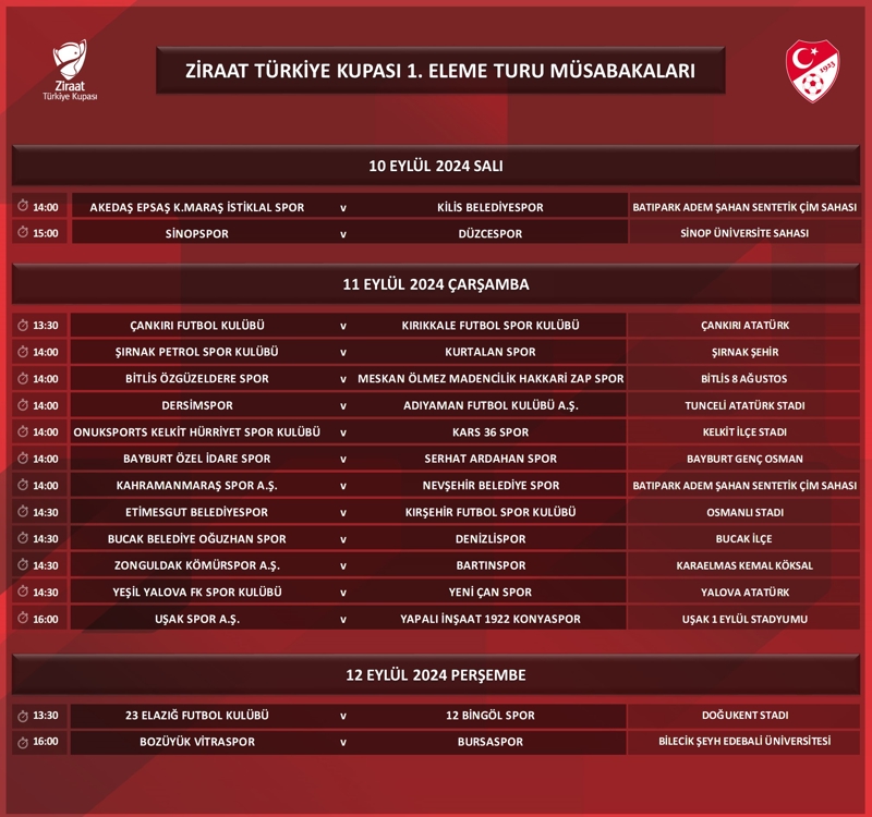 Türkiye Futbol Federasyonu'ndan (TFF) yapılan açıklamaya göre 1'inci Tur maç programı şu şekilde:
