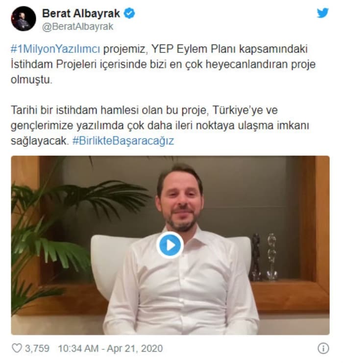 En ileri eğitimler sizler için hazırlandı. Buradan tüm gençlerimize çağrıda bulunuyorum gelin bu eğitimleri alın. Şimdiden kariyer basamaklarınızda sizlere çok büyük katkı sağlayacak bu fırsatı değerlendirin. Evlerimizde kaldığınız bu dönemde önünüzde harika bir fırsat var. Hem kendinizi, hem de ülkenizi çağımızın en büyük rekabet alanı olan yazılım sektöründe en iyi noktaya taşıyalım. Unutmayın; birlikte başaracağız.
