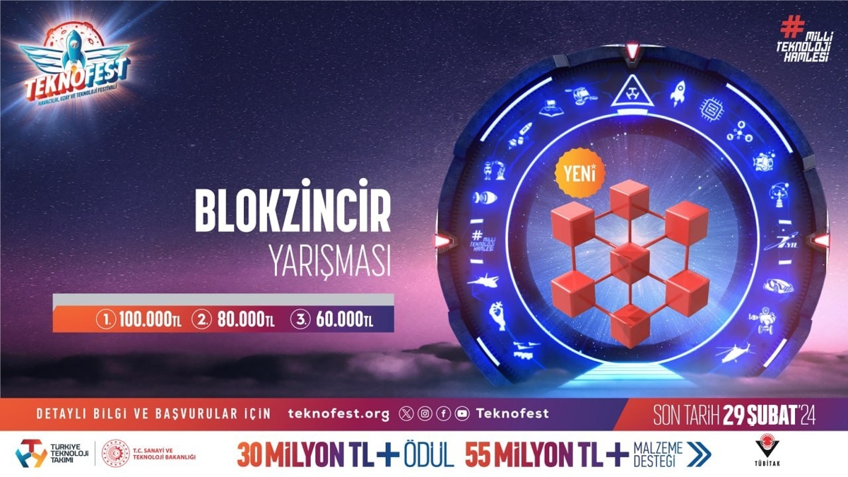 TEKNOFEST kapsamında TÜBİTAK yürütücülüğünde düzenlenen Blok Zincir Yarışması, hem blok zincir teknolojisini daha ileri noktalara taşımak hem de blok zincir teknolojisini kullanarak kimlik, finans, tedarik zinciri ve diğer uygulama alanlarındaki gerçek dünya problemlerine çözüm üretmek, bilgi birikimini ve yetişmiş insan gücünü arttırmak amacıyla düzenleniyor.