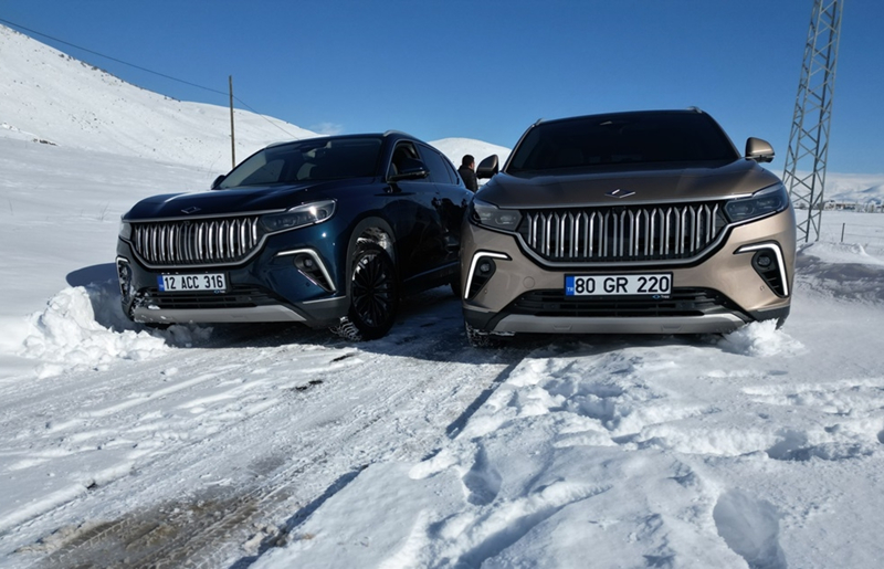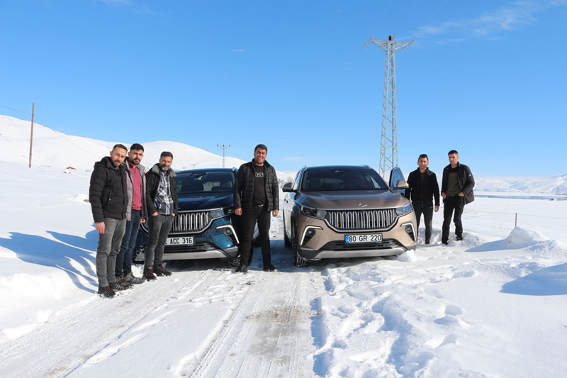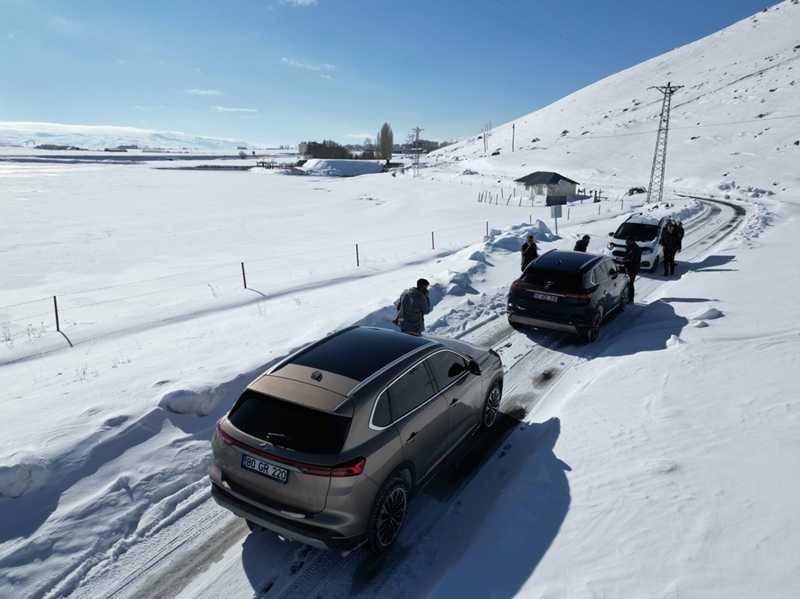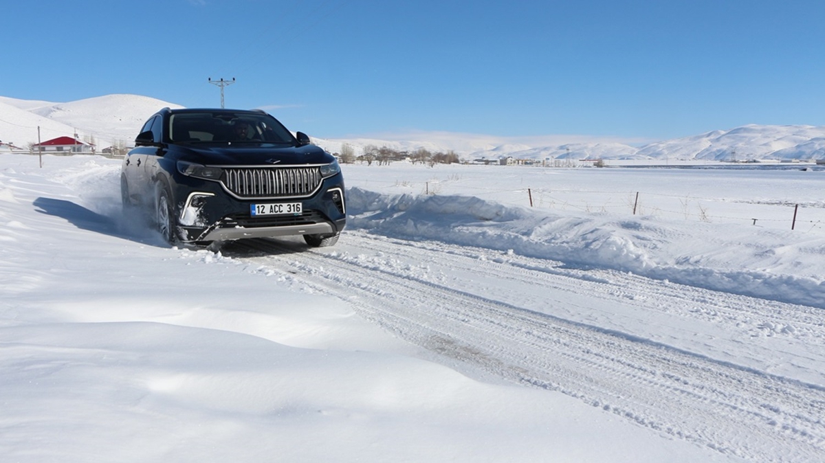 Kar kalınlığının yaklaşık 20 santimetreyi bulduğu karla kaplı yolda sürüş yapan Bingöl ve Şensoy, Togg'un başarılı performansını ortaya koydu.
