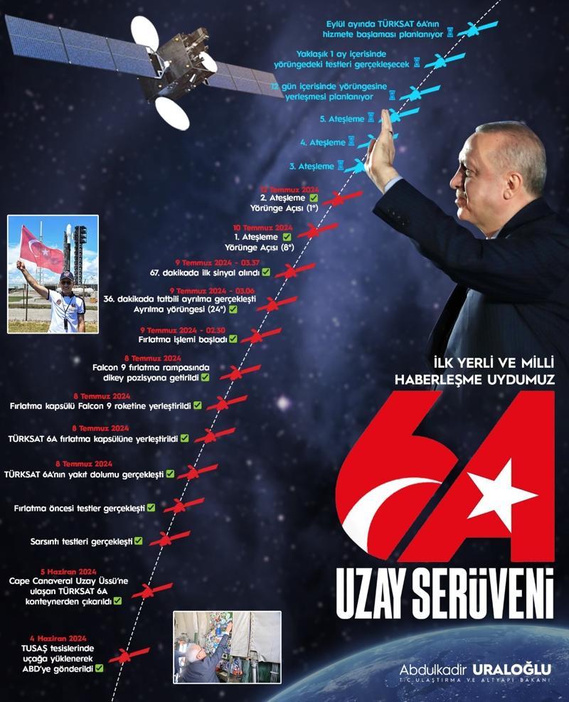 Bakanı Uraloğlu, 14 Temmuz'da Türksat 6A'nın uzay yolculuğunda 3. ateşleme sürecinin başarıyla gerçekleştiğini duyurmuştu.