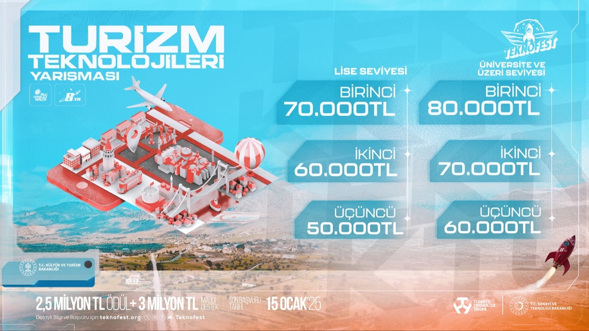 Kültür ve turizm sektörünün dijital dönüşümüne katkıda bulunmak ve geleceğin turizm projelerine imza atmak isteyen tüm gençleri bir araya getiren yarışmanın başvuru süresi, 15 Ocak'ta sona eriyor. Ücretsiz olarak katılım sağlanabilen bu etkinlik hakkında detaylı bilgi almak ve başvuru yapmak için www.teknofest.org adresini ziyaret edebilirsiniz.
