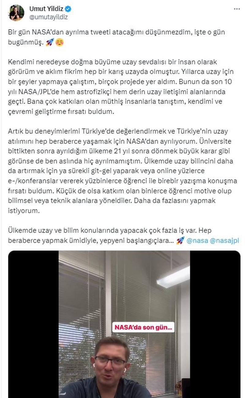 10 yılı aşkın süredir NASA'da astrofizikçi olarak görev yapan Umut Yıldız, sosyal medya hesabından yaptığı açıklama ile herkesi duygulandırdı. NASA'dan ayrıldığını ve çalışmalarına Türkiye'de devam edeceğini açıklayan Umut Yıldız, "Bir gün NASA'dan ayrılma tweeti atacağımı düşünmezdim, işte o gün bugünmüş. Kendimi neredeyse doğma büyüme uzay sevdalısı bir insan olarak görürüm ve aklım fikrim hep bir karış uzayda olmuştur. Yıllarca uzay için bir şeyler yapmaya çalıştım, birçok projede yer aldım. Bunun da son 10 yılı NASA/JPL'de hem astrofizikçi hem derin uzay iletişimi alanlarında geçti. Bana çok katkıları olan müthiş insanlarla tanıştım, kendimi ve çevremi geliştirme fırsatı buldum" ifadelerini kullandı.