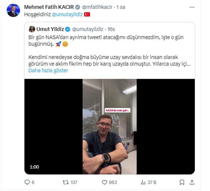 Sanayi ve Teknoloji Bakanı Mehmet Fatih Kacır ise Umut Yıldız'a sosyal medyadan "Hoş geldiniz" mesajı paylaştı.