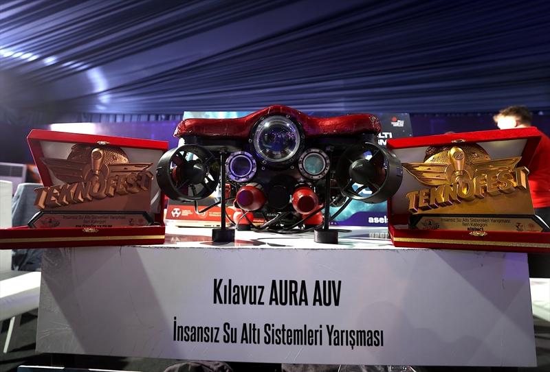 Türkiye Teknoloji Takımı Vakfı ile Sanayi ve Teknoloji Bakanlığının ana yürütücülüğünde Adana Havalimanı'nda süren, Anadolu Ajansının (AA) global iletişim ortağı olduğu TEKNOFEST'te sergilenen insansız su altı aracı, takımın standında ziyaretçilere tanıtılıyor.