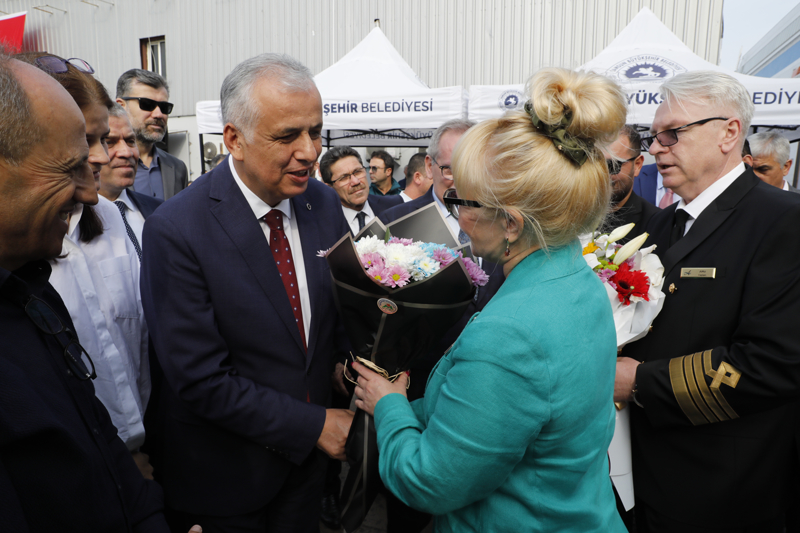 Halk oyunları ekibi ve yöresel yiyeceklerin ikramıyla karşılanan turistler, daha sonra tur otobüsleriyle kentin tarihi ve turistik yerleri görmek için limandan ayrıldı.
