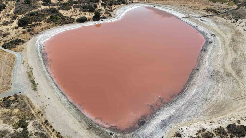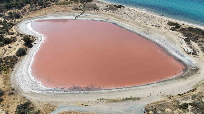 Alexandria Troas Antik Kenti'nin ticaret merkezi olarak uzun süre hizmet eden 2 bin yıllık iç limanı, günümüzde ise kalpli pembe göl olarak turizme katkı sağlıyor. Dış liman ile bağlantısı zamanla ortadan kalkan antik kentin iç limanı bir göle dönüştü. Sıcaklık ve tuzluluğun artmasından dolayı 'dunaliella salina' adlı mikroskobik bitkisel canlının fazla üremesinden kaynaklı yaşanan pembe ve kırmızıya yakın tonlar, göle farklı bir görünüm kazandırıyor. Zamanla da doğa şartlarına bağlı olarak suyun çekilmesi ile kalp şeklini aldı. İçerisindeki tuzlu suyun yılın belli dönemlerinde pembe renge bürünmesiyle 2 bin yıllık antik liman, dünya üzerinde bilinen ve pembe renge sahip 8 gölden birisi haline geldi. Ziyaretçilerin çekip, sosyal medyada paylaştığı fotoğraflarla popülerliği artan kalp şeklindeki gölün suyu, bugünlerde yine pembeye çalmaya başladı. Pembeye bürünen ve kalp şekli ile dikkati çeken 'Kalpli Göl', drone ile havadan görüntülendi. Kalpli göl doğal dokusu bozulmaması ve zarar görmemesi için araç trafiğine kapatıldı. Ziyaretçiler yaya olarak gölün olduğu alanı gezebilecek.