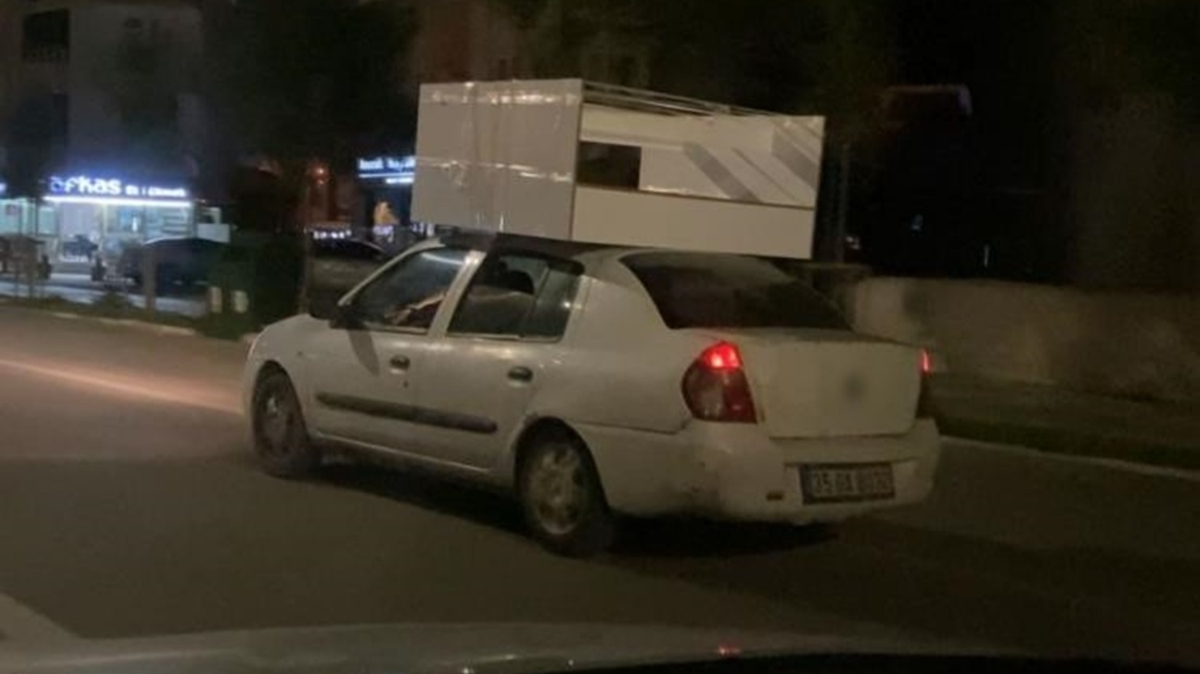Olay Makas Kavşağı'nda meydana geldi. Dolabı 35 GA 8032 plakalı aracın tavanına koyup koli bandı ile yapıştırdıktan sonra trafiğe çıkan sürücü herkesin yüreğini ağzına getirdi. Tavana sadece koli bandı ile yapıştırılmış dolabın yüklendiği otomobille trafikte seyreden sürücü, kazaya davetiye çıkartarak hem kendi canını hem de diğer sürücülerin canını hiçe sayıp kilometrelerce seyretti. Birde seyir halinde telefonla konuşan araç sürücüsü, Atatürk Bulvarı'nda seyrederken kırmızı ışıkta da durmayıp yoluna devam ederek adeta trafik kurallarını alt üst etti. Coğlaki Mahallesi Somuncu Baba Külliyesi'ne kadar giden sürücü burada aracını park ederek ayrıldı.