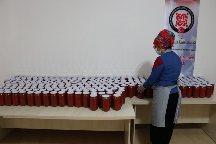 Kaymakamlık ve belediyenin desteğiyle, kadınların hünerli elleriyle hazırlanan konserve ve turşular, ihtiyaç sahiplerinin evlerine ulaştırılıyor.