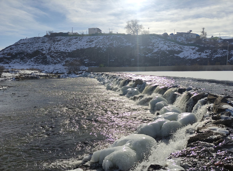 Kışın sert ve çetin geçtiği kentte özellikle sabaha doğru etkili olan dondurucu soğuk nedeniyle kent merkezinden geçerek, Gürcistan ve Azerbaycan üzerinden Hazar Denizi'ne dökülen Kura Nehri'nin yüzeyi buzla kaplandı. Donan nehrin devamında kurulan 'set' adeta bir şelale görünümünü aldı.