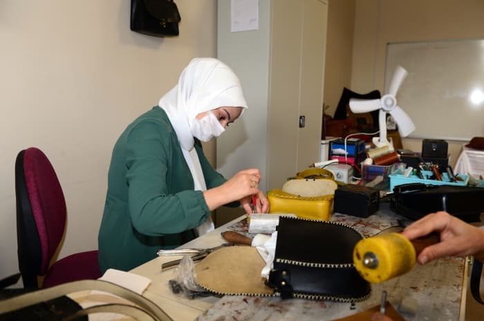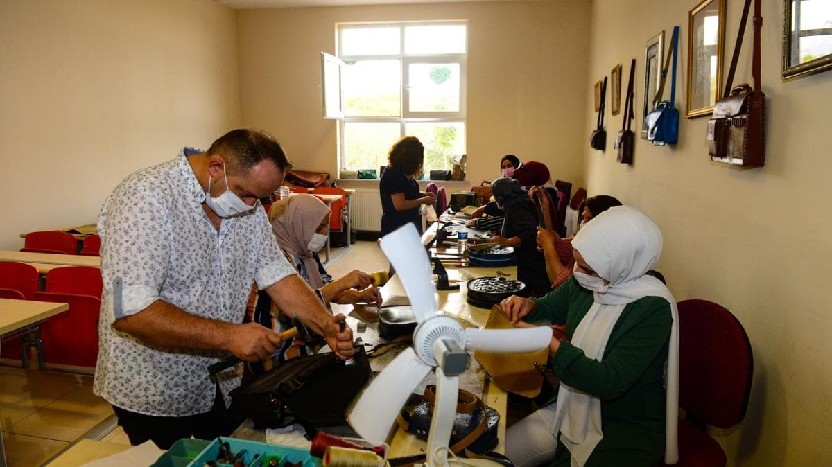 Kursta deriden çeşitli aksesuar ve ev eşyası üretmenin yanında İŞKUR'dan aldıkları maaşla da aile ekonomilerine katkıda bulunan 15 kadın kursiyer, gelecekte geçim kaynaklarını oluşturacak deri işleme sanatının inceliklerini öğreniyor.