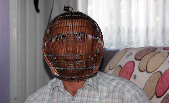 Bir motorsiklet kaskını örnek alarak, yaklaşık 40 metrelik bakır kablolardan yaptığı kafese iki kilit koyduğunu belirten Yücel, "Elektrikçilerden bakır tel alarak 40 metreye yakın tel ile buna benzer bir kafes yaptım ama bunu da yapmak kolay olmadı. Bir motorsiklet kaskım vardı. Bunun bana model olarak uyabilecğini düşünüp bununla birlikte bir ayı aşkın süredir uğraşma sonucu böyle bir kafes yaptım. Kafesimizde iki kilit var. Bu iki kilitle evden çıkarken kafesi takıp kilitleyeceğim. Bir anahtarı eşime bir tanesini de kızıma vereceğim ki kesinlikle evden çıktığım zamanlarda yine bu kafesimi takarak çıkacağım." dedi.