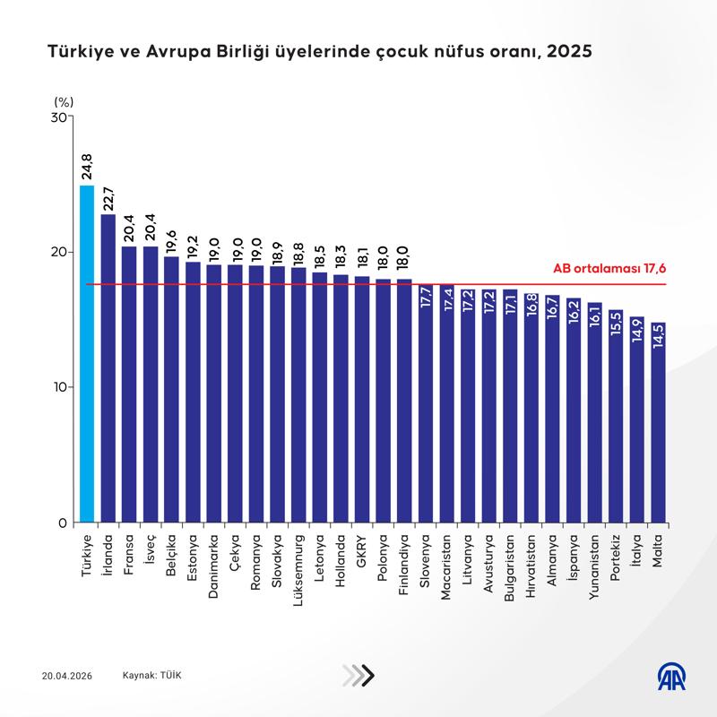Avrupa Birliği (AB) üyesi 27 ülke incelendiğinde, 2025'te çocuk nüfus oranının AB ortalaması yüzde 17,6 olarak kayıtlara geçti. AB üyeleri arasında en fazla çocuk nüfus oranına sahip ülkeler, sırasıyla yüzde 22,7 ile İrlanda, yüzde 20,4'er ile Fransa ve İsveç olarak kaydedildi.
