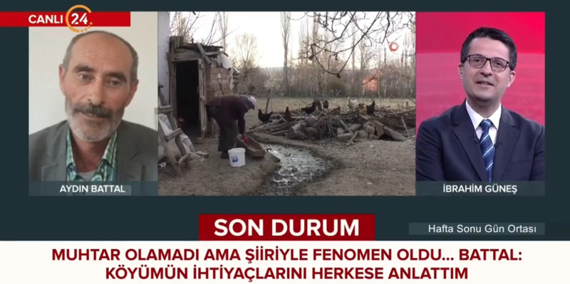 Yayında asıl dikkatimi çekense Sağlık Bakanı Fahrettin Koca ve Adalet Bakanı Yılmaz Tunç'un seçimi kaybeden Battal'ı arayıp bir ihtiyacının olup olmadığını sormasıydı. Aydın Battal, muhtar olamadı ama sosyal medya fenomeni olma ihtimali var. Zira şiirleri epey özlü.. Ama bunun için de internet paketi desteğine ihtiyacı var.