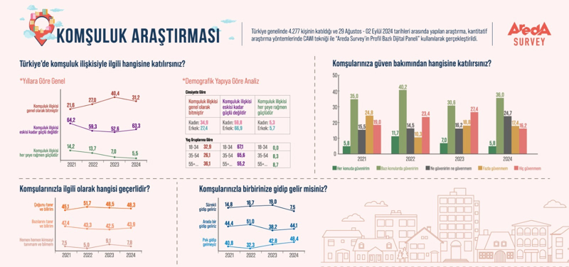 Areda Survey araştırma şirketinin Türkiye genelinde 4.277 kişinin katılımıyla gerçekleştirdiği araştırmaya göre, Türk halkının yüzde 63,3'ü komşuluk ilişkilerinin eskisi gibi güçlü olmadığını ve yüzde 31,2'si komşuluk ilişkilerinin tamamen bittiğini düşünüyor! Komşusuna anahtarını bırakacak kadar güvenenlerin oranıysa çok çok daha düşük.
