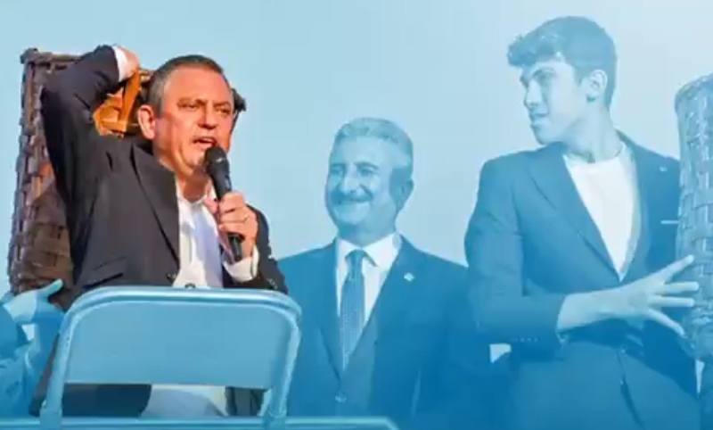 Arkadan ve yandan iki kişinin desteğiyle boş küfeyi sırtlayan Özel, hoş ama boş bir şov yaptı.