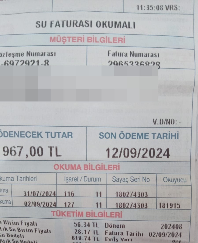 11 metreküp su için gelen Su faturası 967 lira.