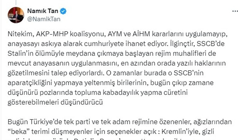 Peki aynı Namık Tan, ABD'li 12 senatörün Uluslararası Ceza Mahkemesi hakimlerini tehdit eden mektubu için tek kelime etti mi? Elbette hayır. Üstelik, o tehdit mektubunda açık açık "Netanyahu için tutuklama kararı çıkarırsanız biz de sizi hedef alırız" deniliyordu. Ya da aynı Namık Tan, Refah'ta yeni katliamlara imza atan İsrail ve Netanyahu hükümetini eleştirdi mi? Yine hayır... O yüzden Namık Tan bir varmış, bir yokmuş...